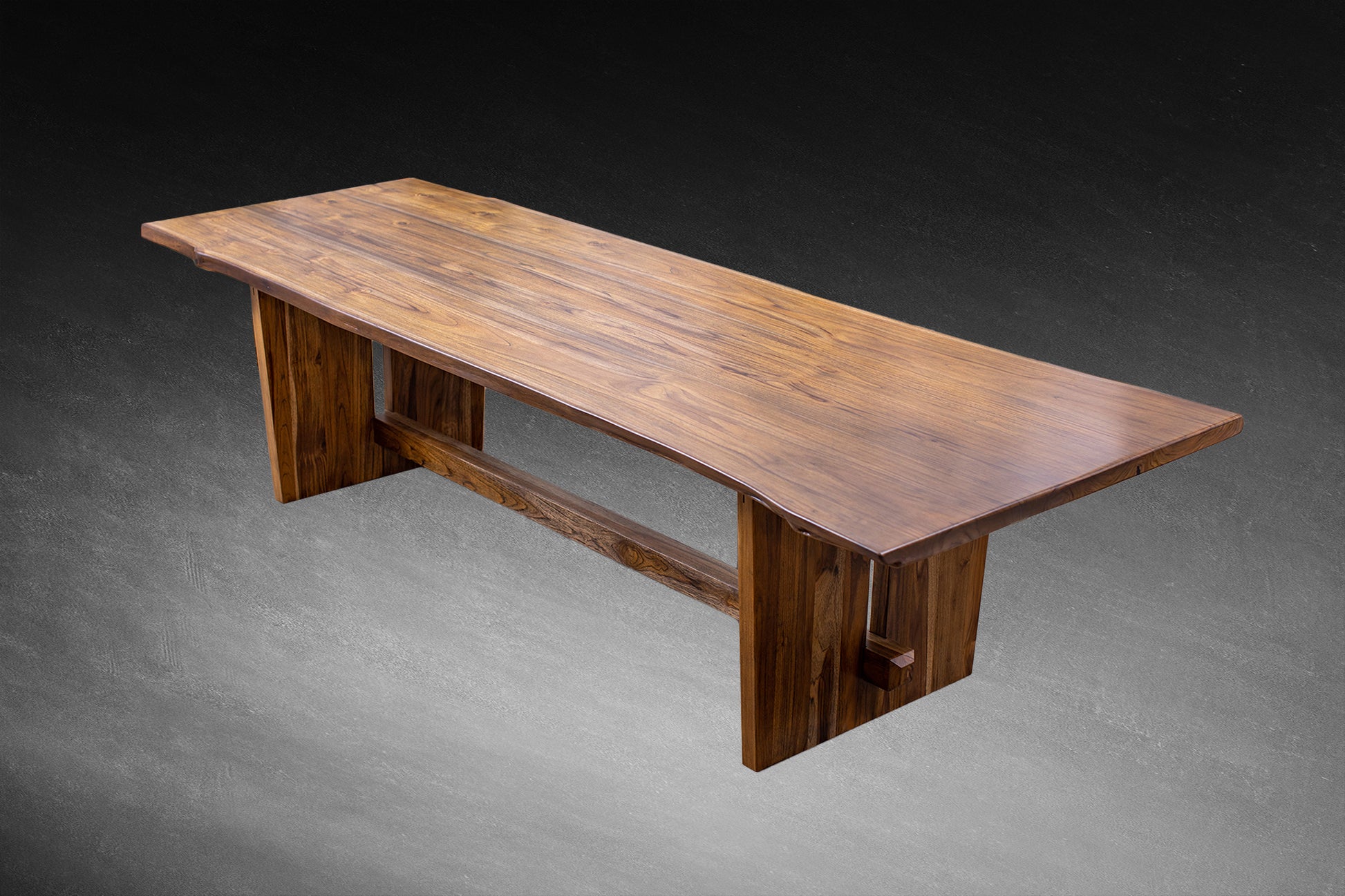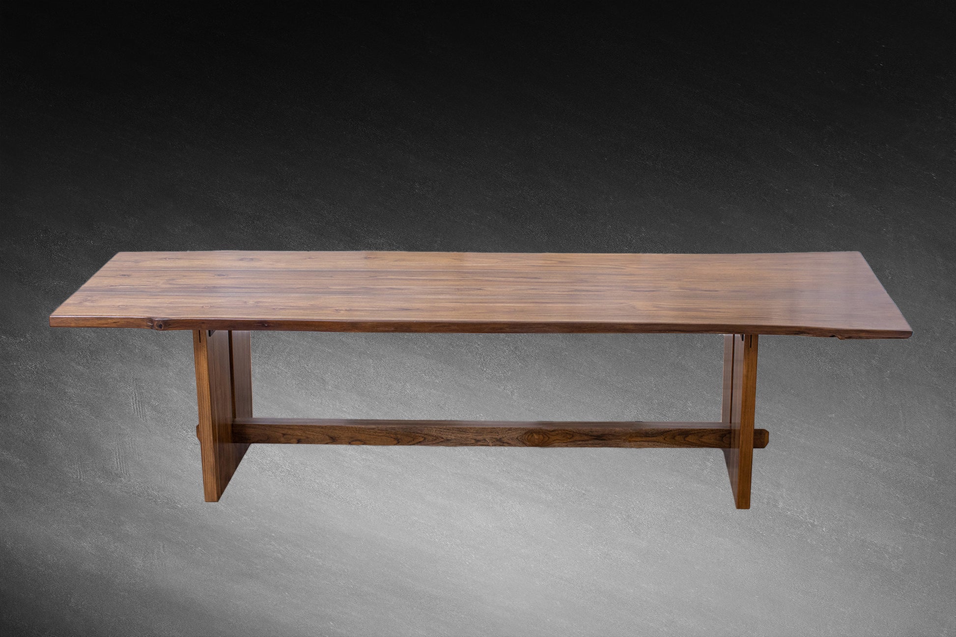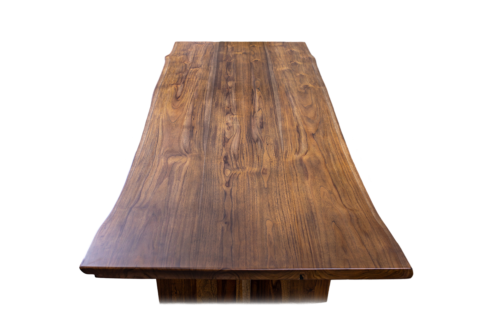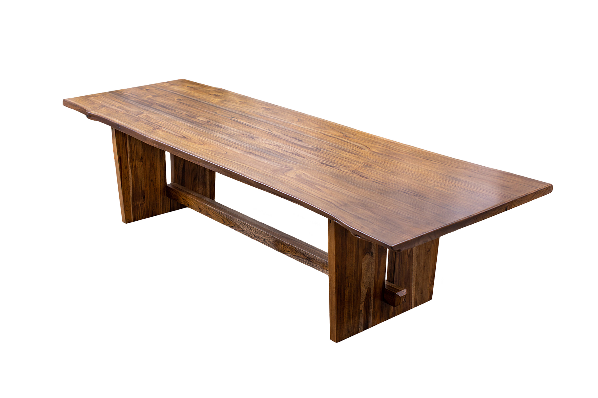 Crafted from double book-matched slabs of premium teak, this 121x46" dining table highlights the rich tones and graceful grain of solid wood in our Autumn Smooth finish. The live edge design preserves the natural contours of the tree, while the book-matched layout creates a striking, mirrored effect across the tabletop. With its smooth surface and organic form, this statement piece combines elegance and raw beauty—perfect for those who appreciate both modern sophistication and nature’s artistry.