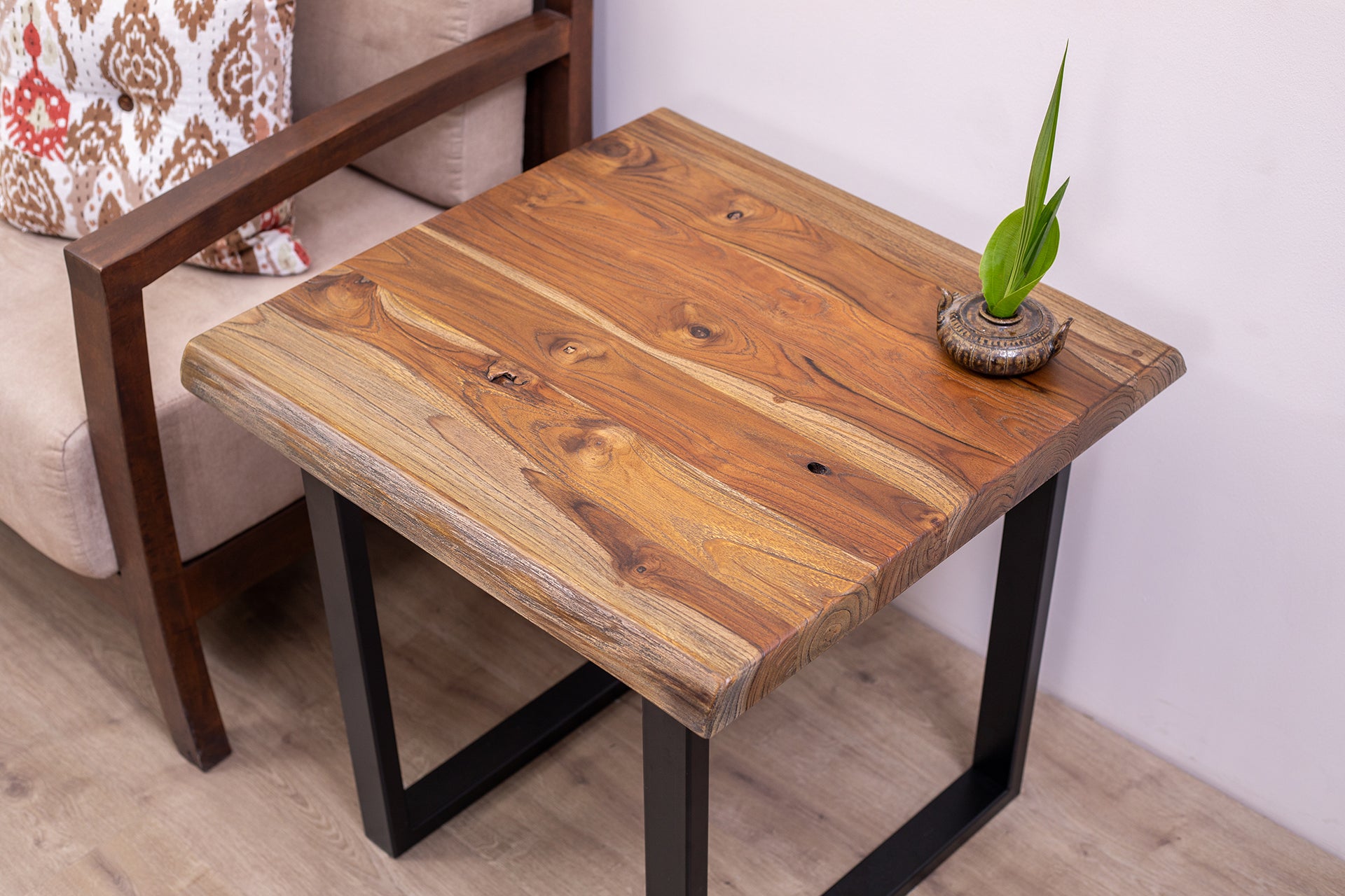 24x24" Teak Live Edge Square Leg Side Table, Organic-Textured Autumn Finish