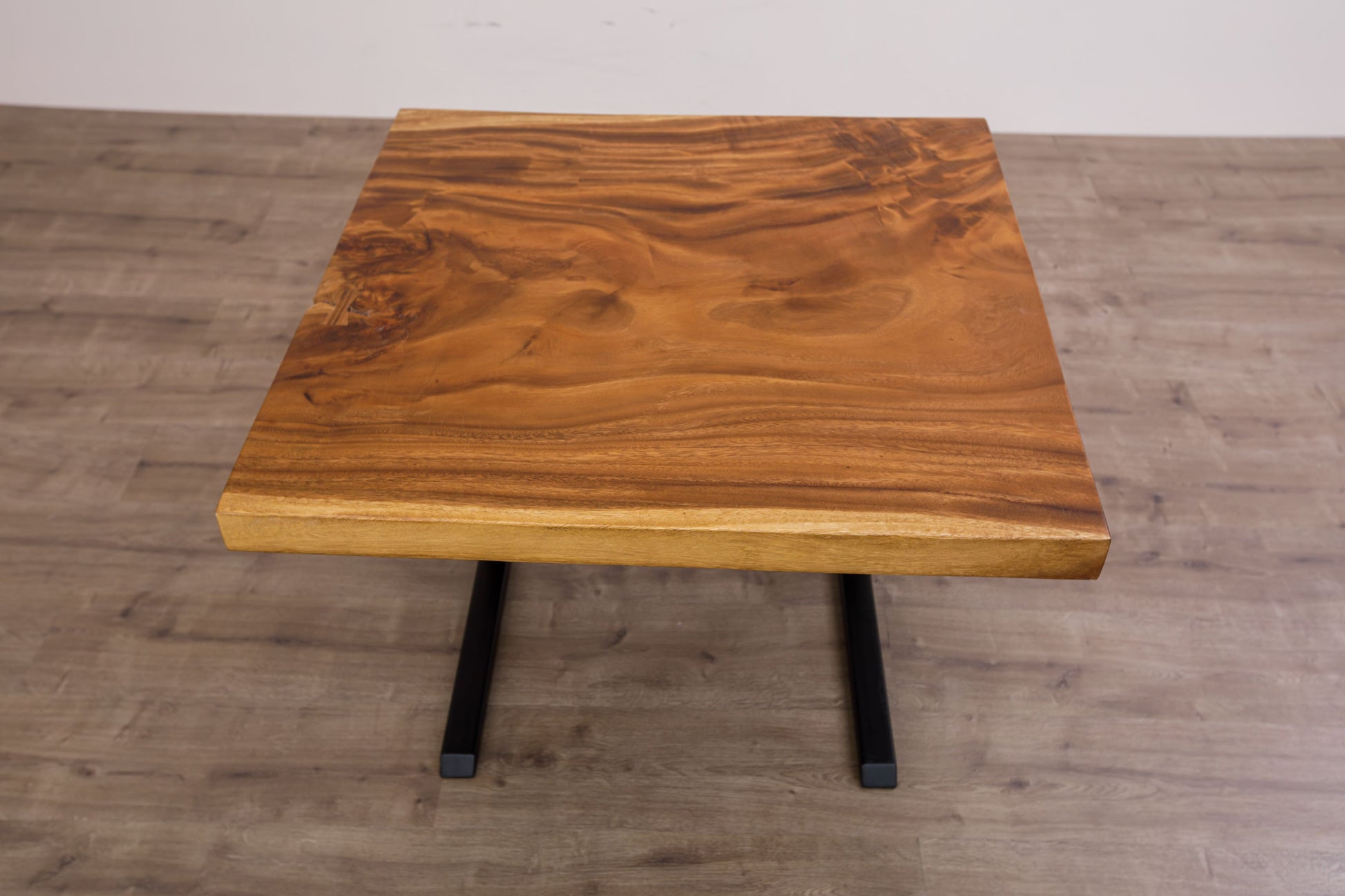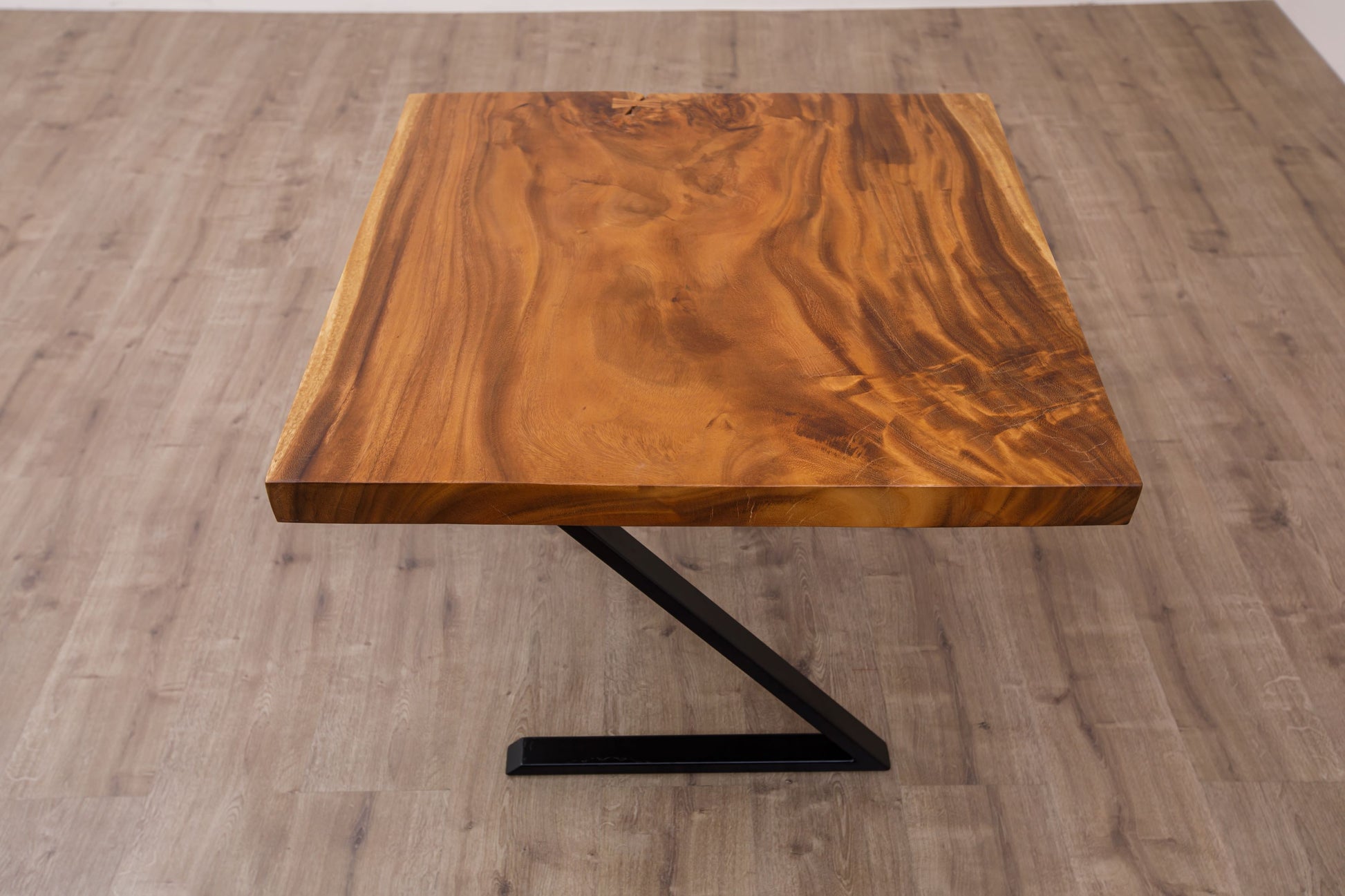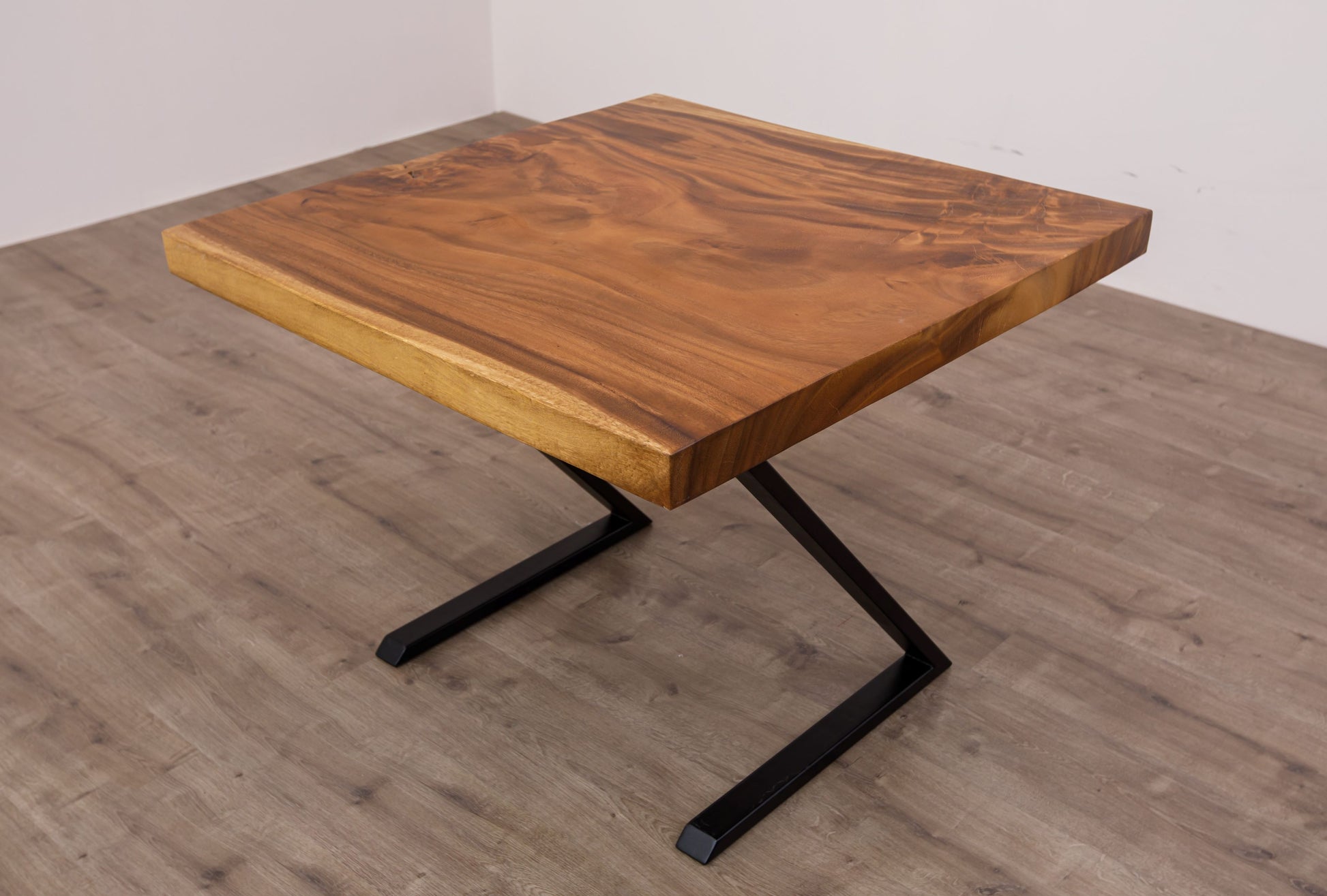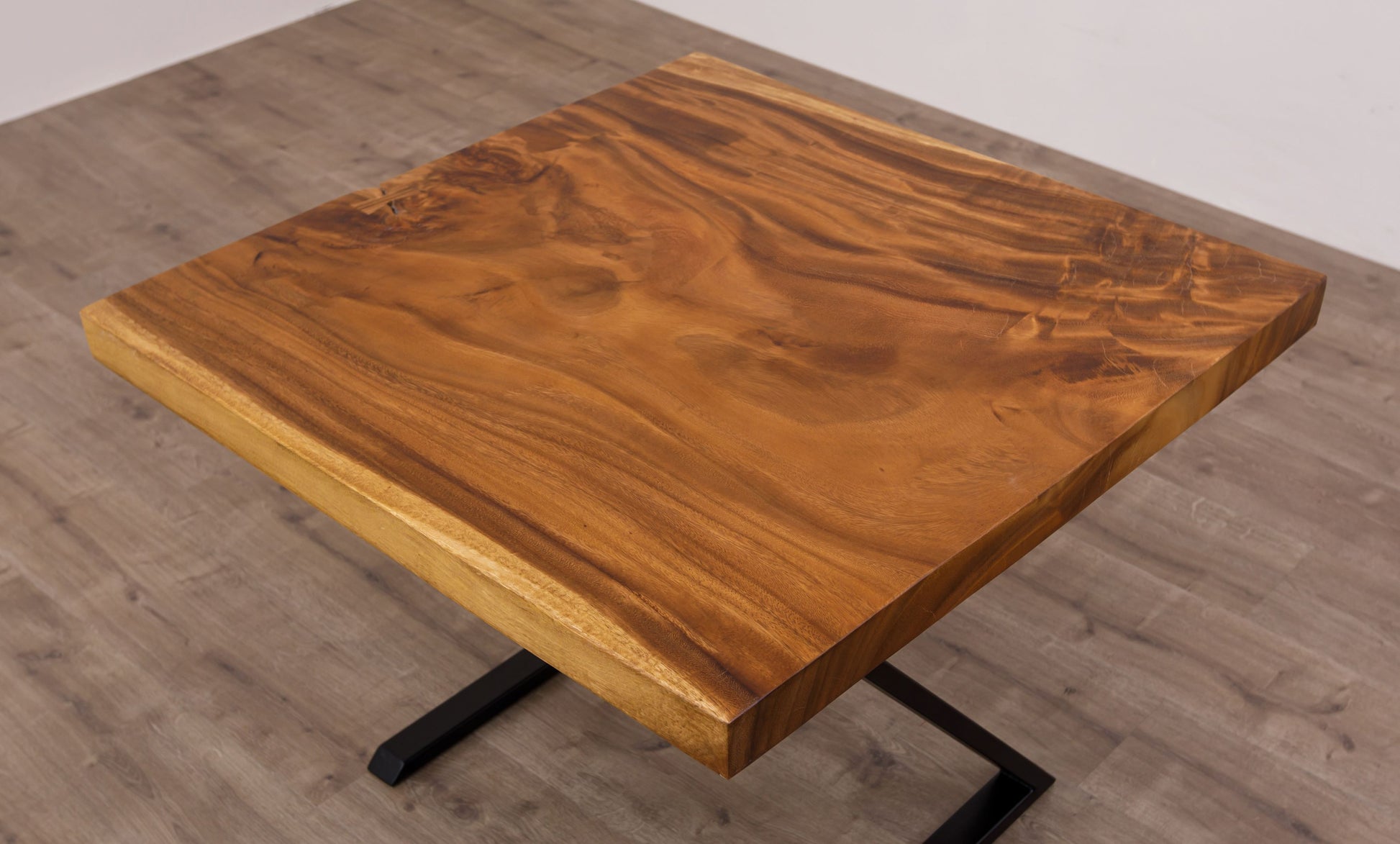 This 30x30'' side table is crafted from solid Acacia wood, showcasing its rich grain and natural beauty. The powder-coated Z-shaped leg delivers a minimalist profile with a dynamic twist—bringing both style and stability to your space