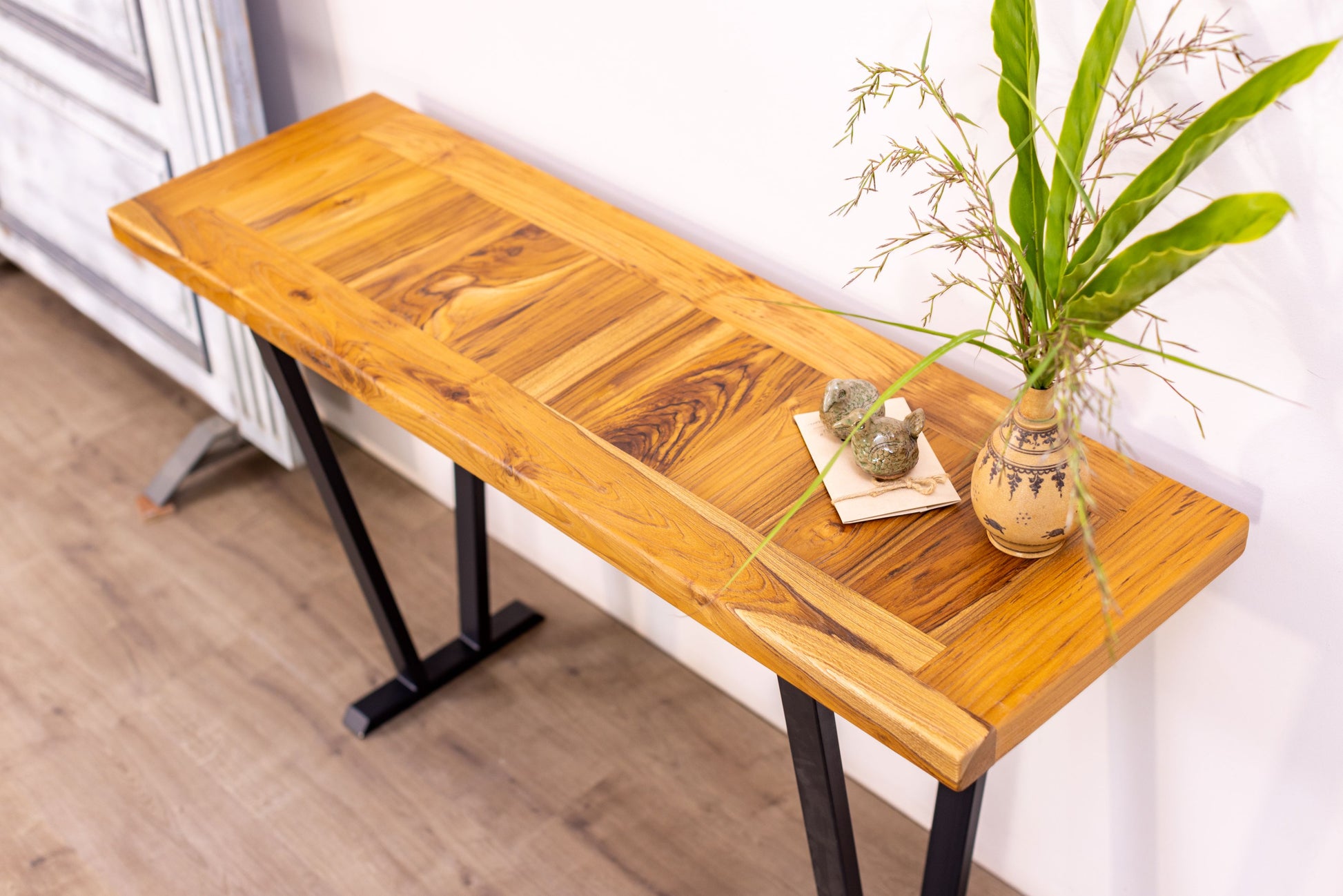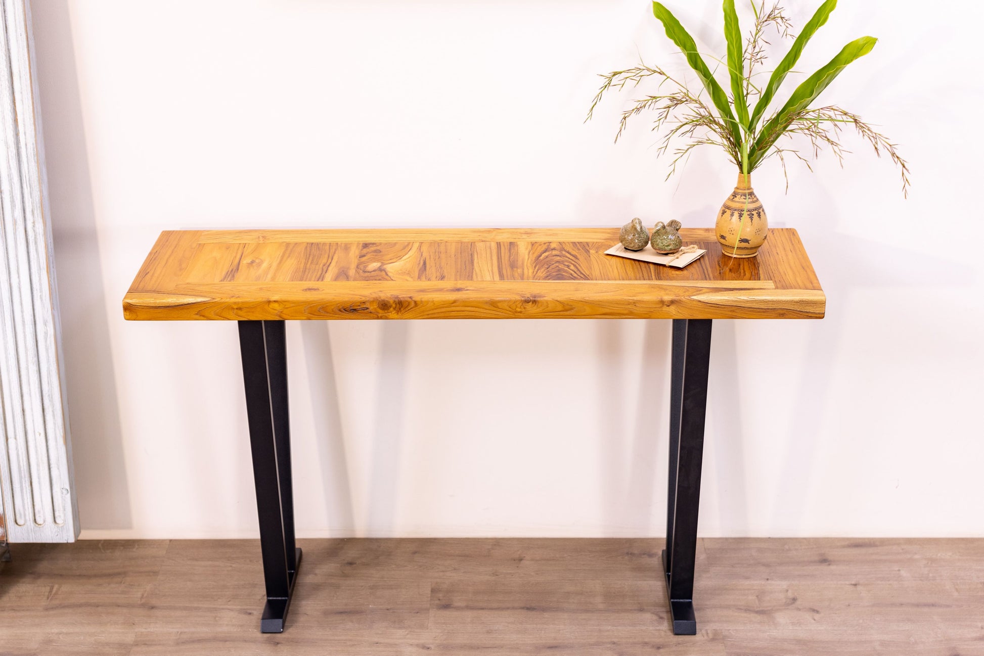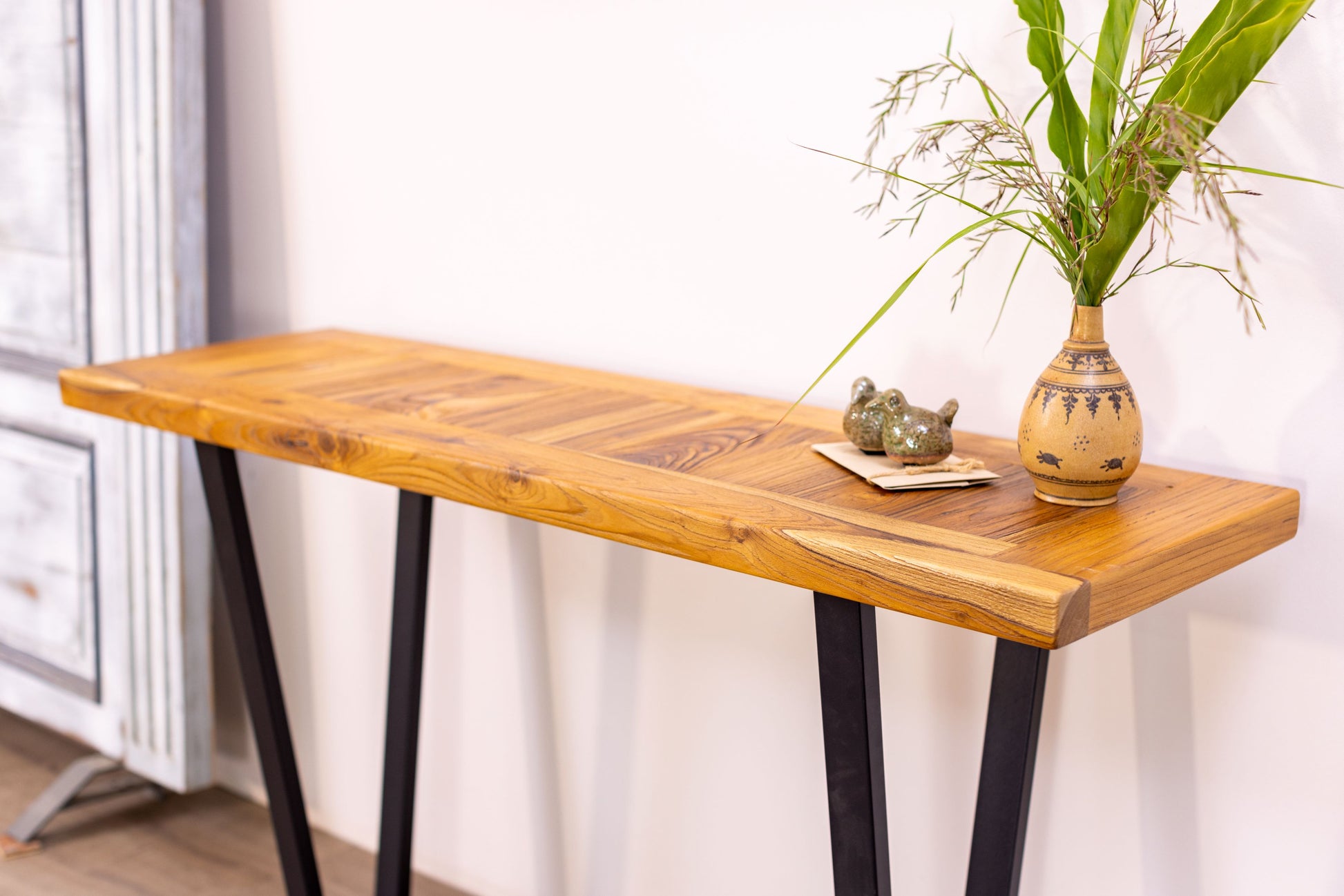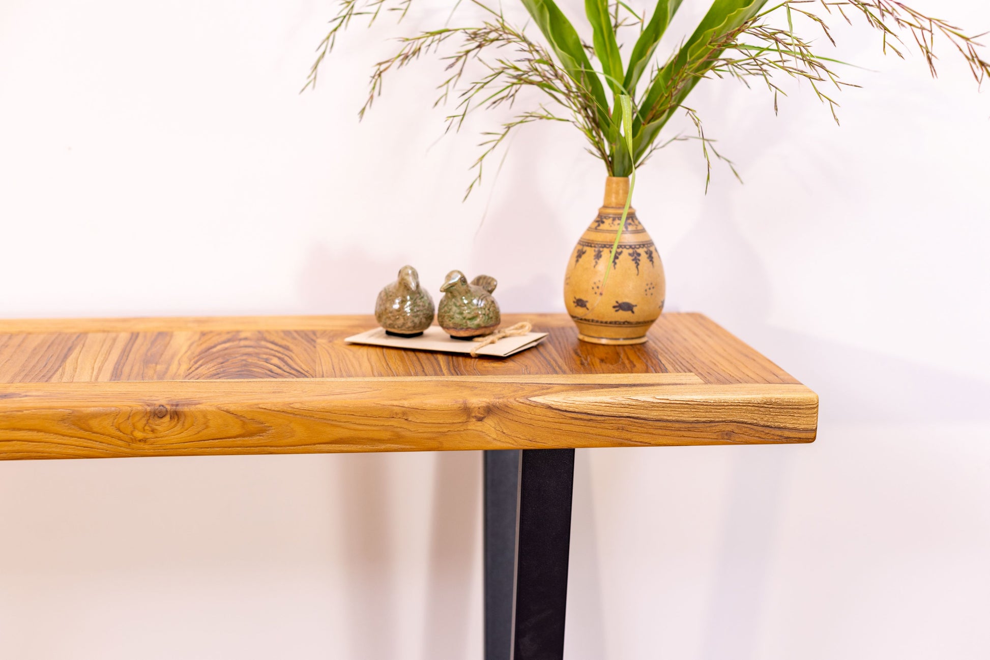 Elevate your space with our handcrafted mission edge teak console table, highlighting the clean lines of solid wood paired with sleek, durable metal legs — a perfect blend of timeless craftsmanship and contemporary style.