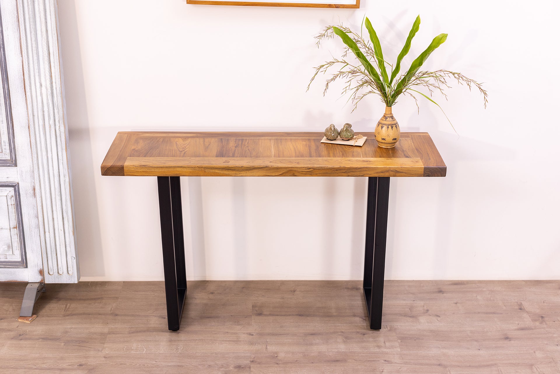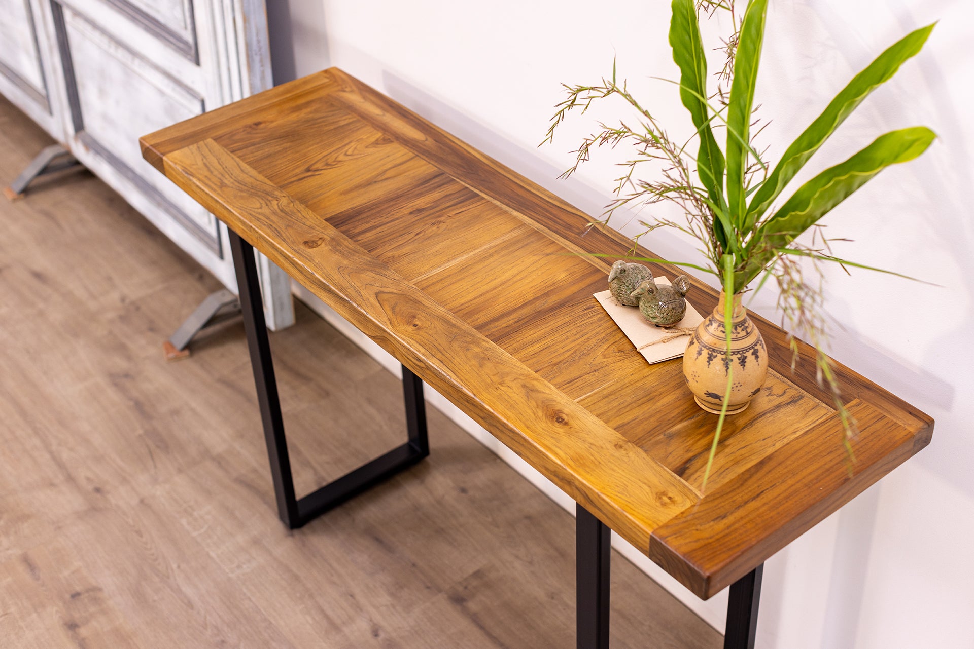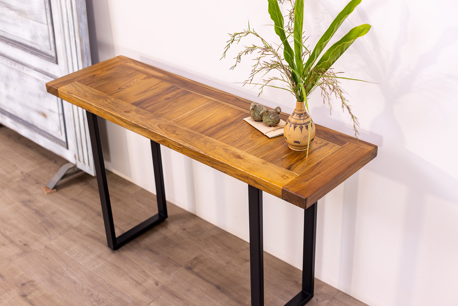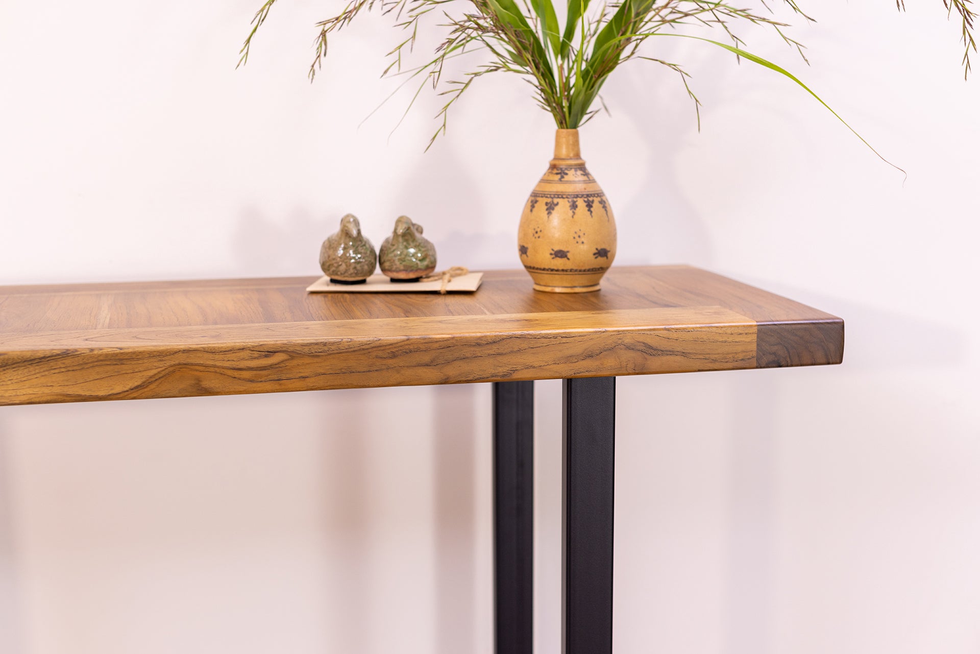 Elevate your space with our handcrafted Mission edge teak console table, highlighting the clean lines of solid wood paired with sleek, durable metal legs — a perfect blend of timeless craftsmanship and contemporary style.