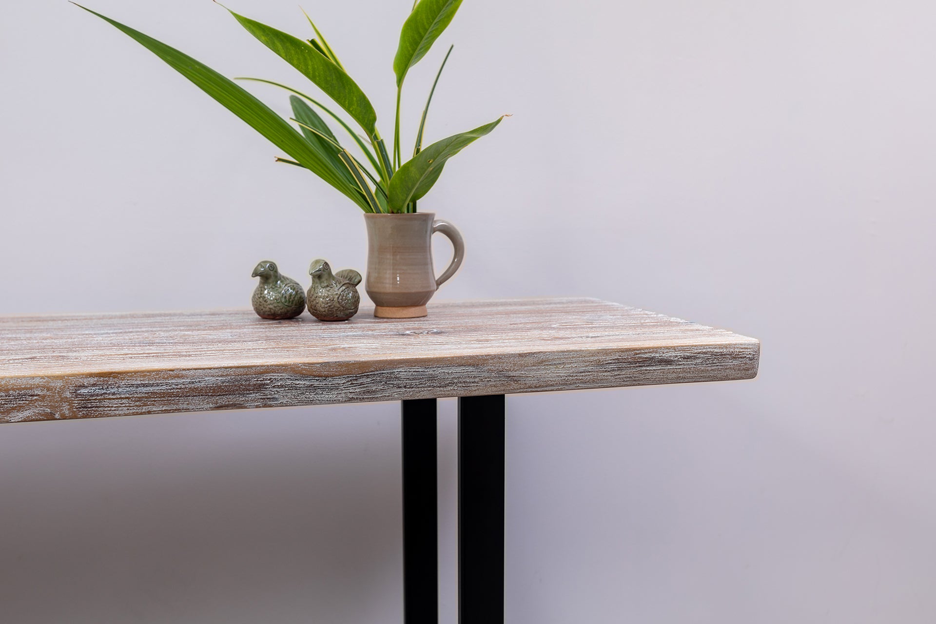 Our handcrafted live edge teak console table, showcasing the natural curves of solid wood paired with sleek, durable metal legs, offers a perfect balance of raw beauty and timeless craftsmanship. (Also available in 52x16")