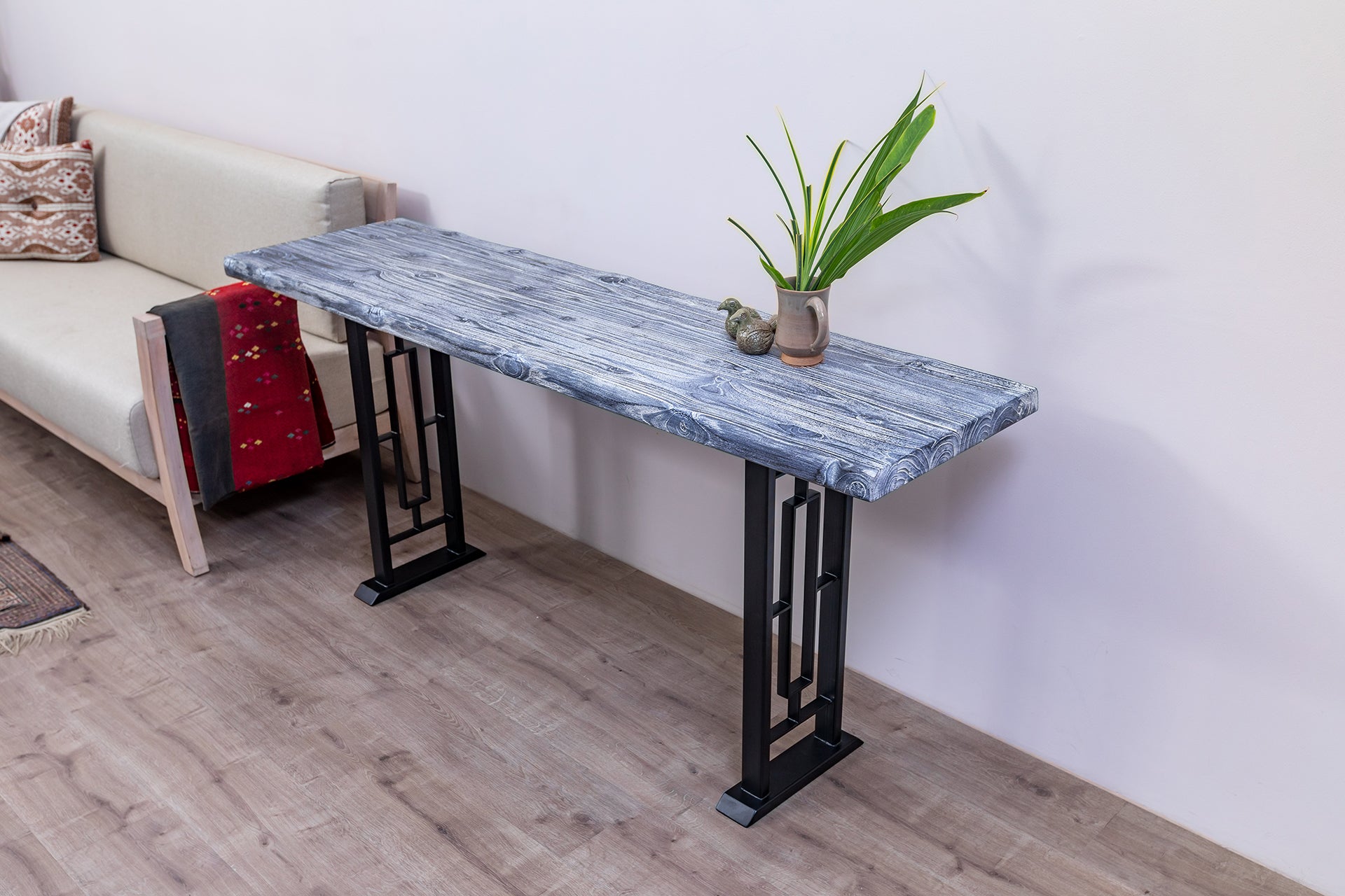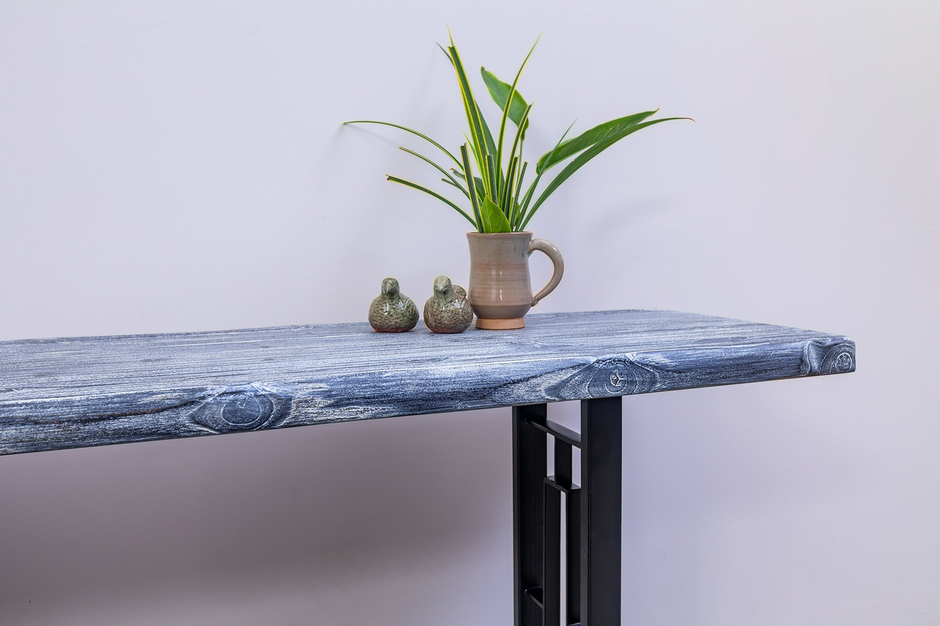 Our handcrafted live edge teak console table, showcasing the natural curves of solid wood paired with sleek, durable metal legs, offers a perfect balance of raw beauty and timeless craftsmanship. (Also available in 52x16")