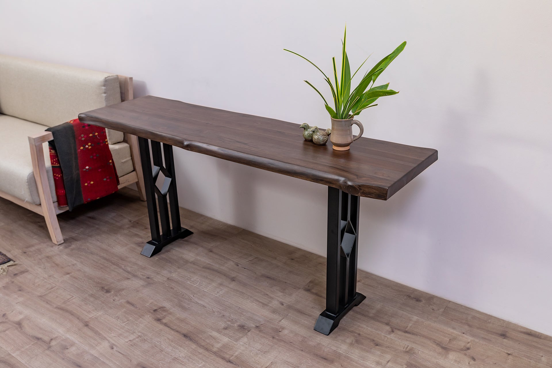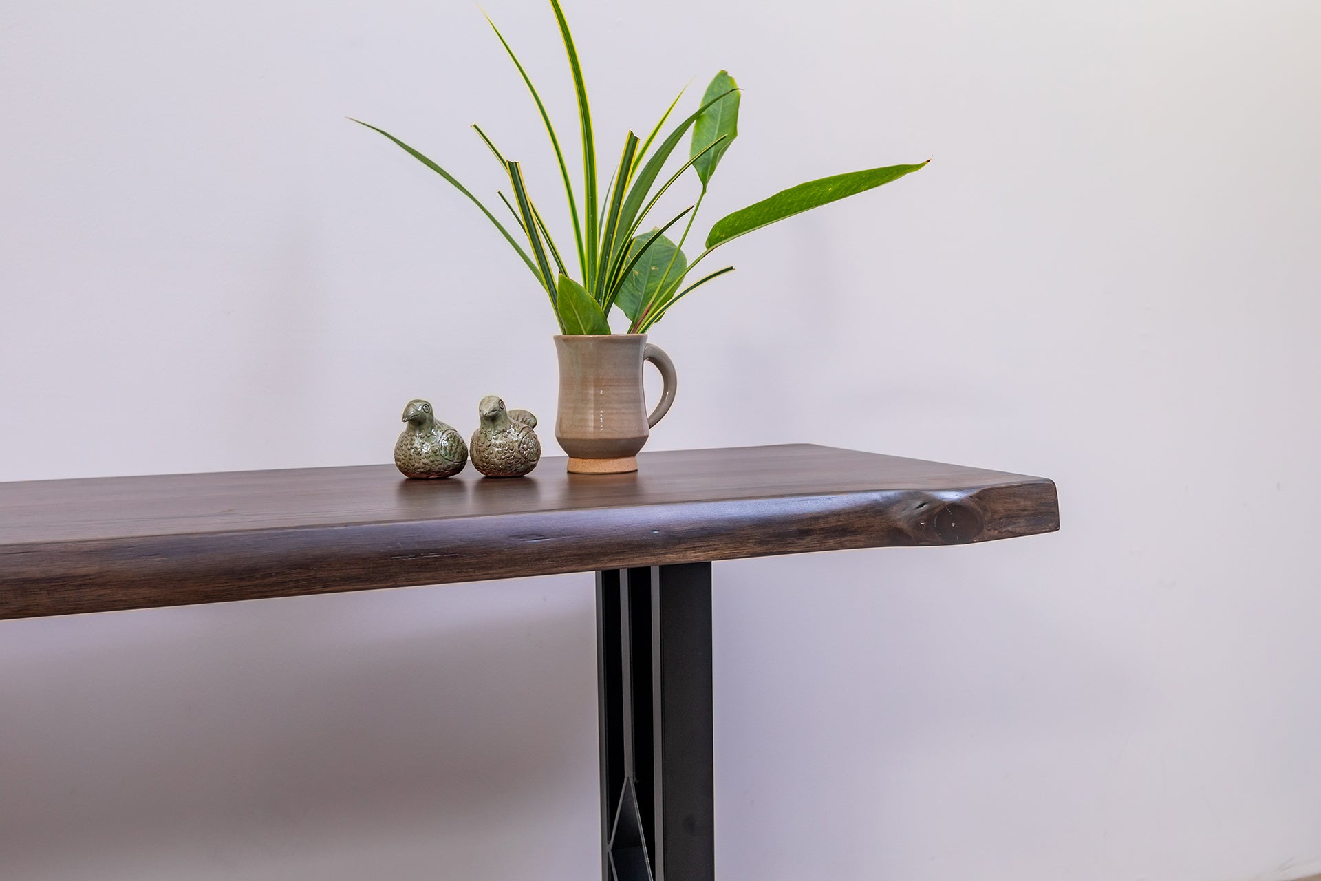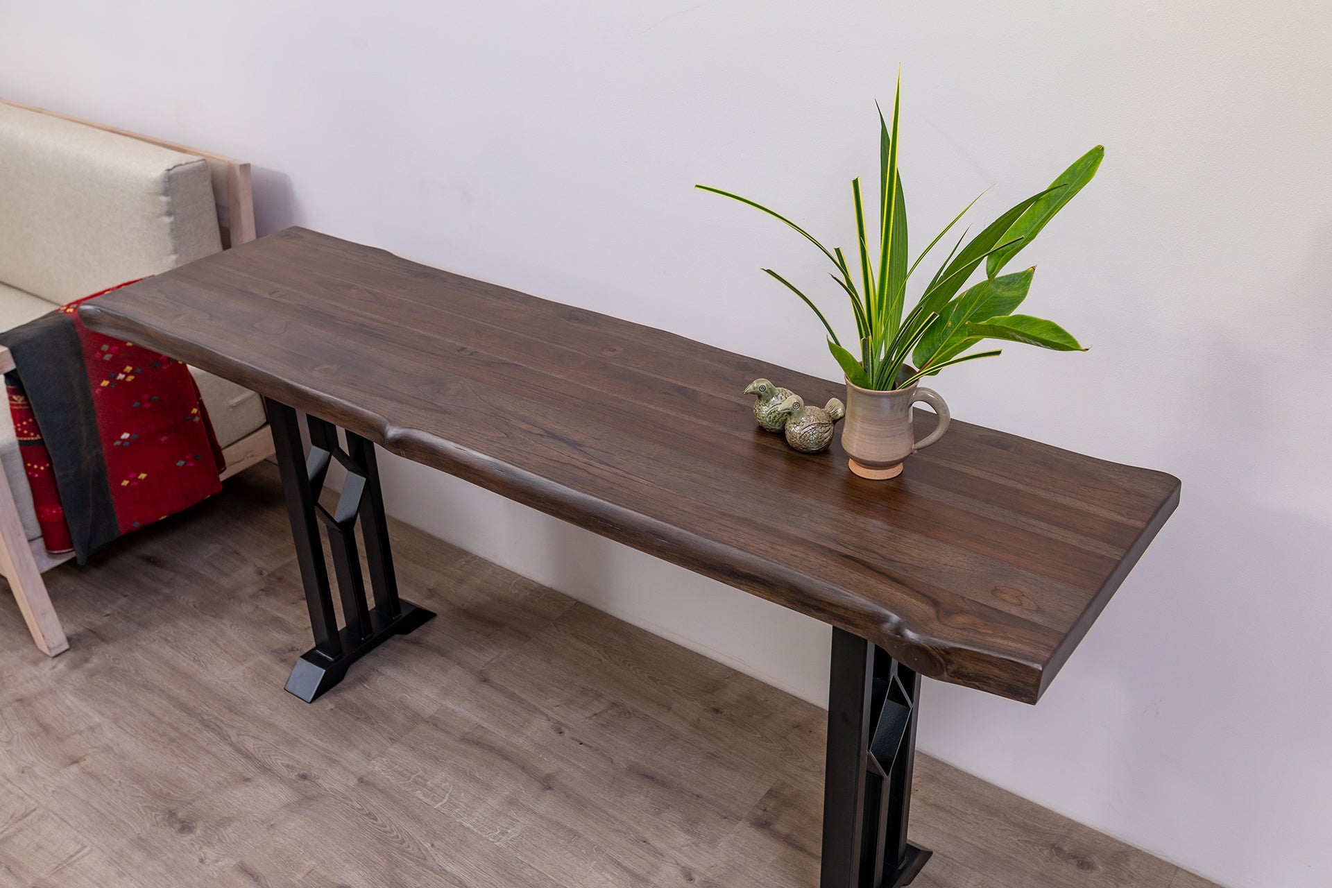 Elevate your space with our handcrafted live edge teak console table, showcasing the natural curves of solid wood paired with sleek, durable metal legs — a perfect blend of organic beauty and modern design.