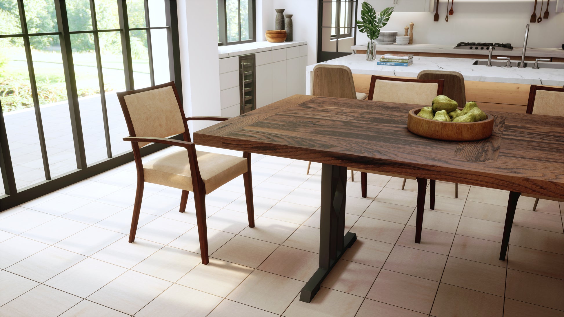 Handcrafted in Thailand from sustainably sourced North American Glacier Oak, this solid 2-inch-thick tabletop features full-length boards for a seamless, uninterrupted surface. Finished in a light walnut “Autumn” stain, its subtly brushed texture enhances the natural grain, offering rich depth and tactile appeal—never veneered, only pure, solid wood.