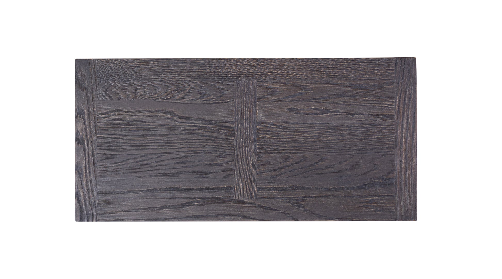 Handcrafted in Thailand from North American Glacier Oak, this 2-inch-thick top features full-length boards for a seamless, refined appearance. Finish in an "Anthracite Grey" stain, highlighting the natural wood grain. Its subtly brushed texture enhances the natural grain, offering rich depth and tactile appeal—never veneered, only pure, solid wood.