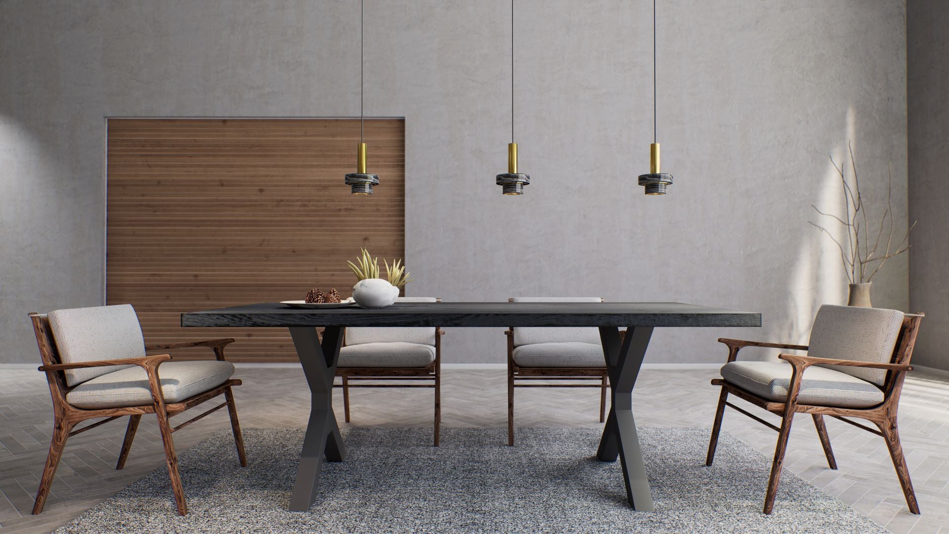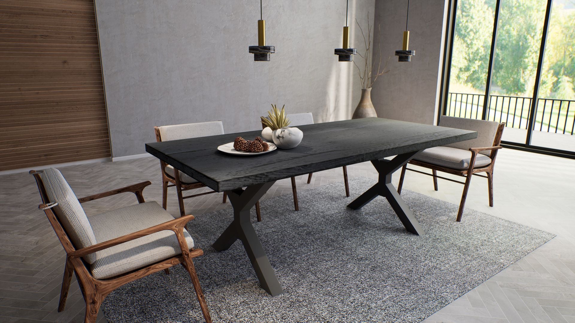 A striking balance of organic warmth and industrial sophistication, this dining table features a solid oak tabletop crafted from hand-selected, sustainably sourced wood. The oak’s natural grain and refined finish bring depth and character, while the sleek, custom-forged matte powder-coated X shape metal legs introduce a bold, contemporary edge. Designed for both aesthetic impact and everyday durability, this piece effortlessly complements modern, transitional, and loft-inspired interiors—an elevated centerpiece for discerning tastes.
