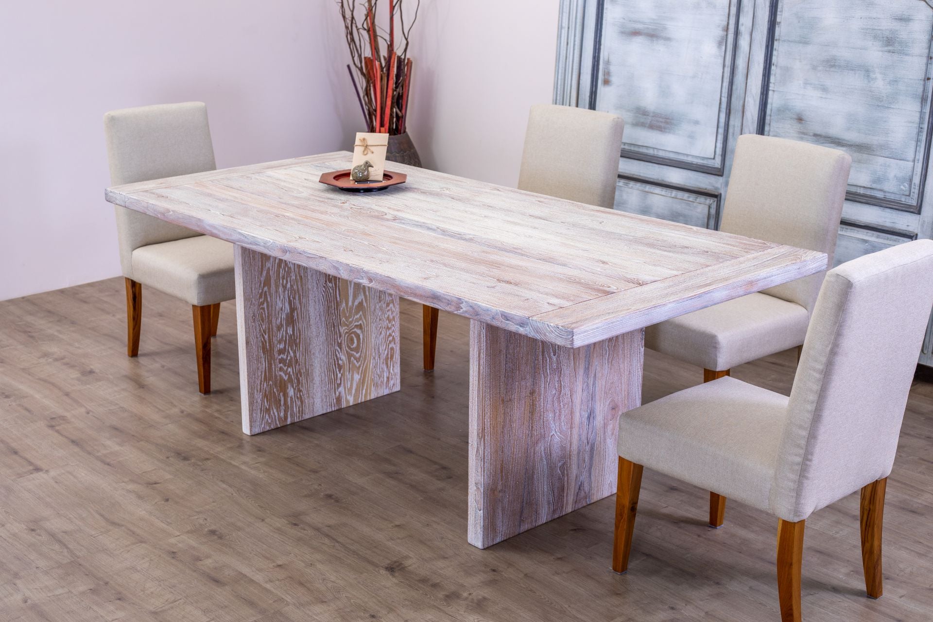 Crafted from premium Thai/Burmese teak, this dining table features a 2-inch-thick solid wood top, beautifully brushed texture, and finished in a "Sun-Bleach" whitewashed stain. Made from pure hardwood—never veneer—it celebrates the rich grain, natural warmth, and lasting durability of authentic teak. Showcasing the natural beauty of 100% solid teak, this dining table is a timeless piece of craftsmanship. The richly grained teak wood is hand-finished to enhance its warm tones and organic elegance. Complementing its surface, the gracefully contoured wooden legs offer a harmonious balance of strength and sophistication. A seamless blend of tropical hardwood and refined design, this piece is ideal for interiors that favor natural textures with a touch of elevated charm. Contact us to explore additional color combinations for this table. |