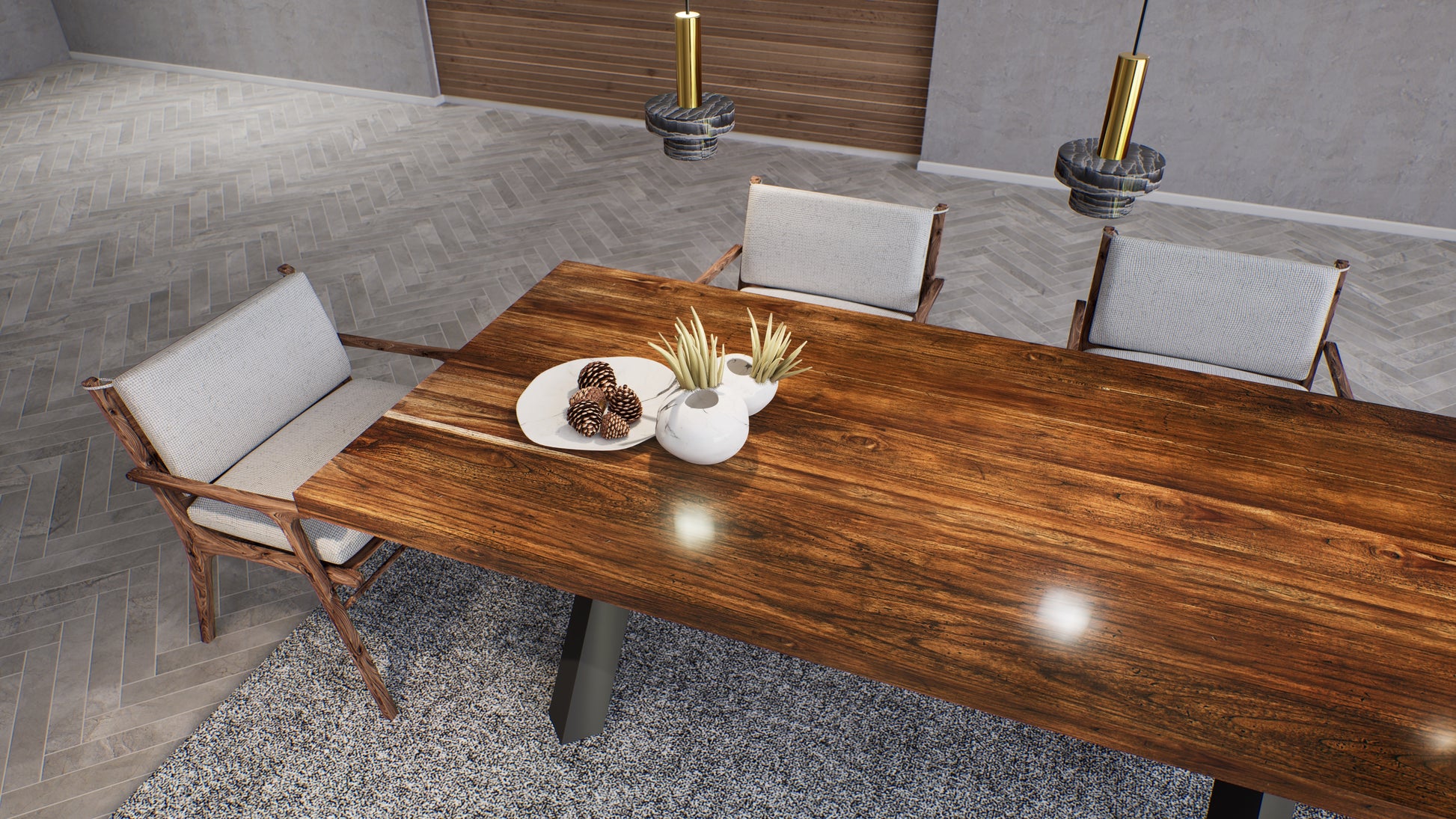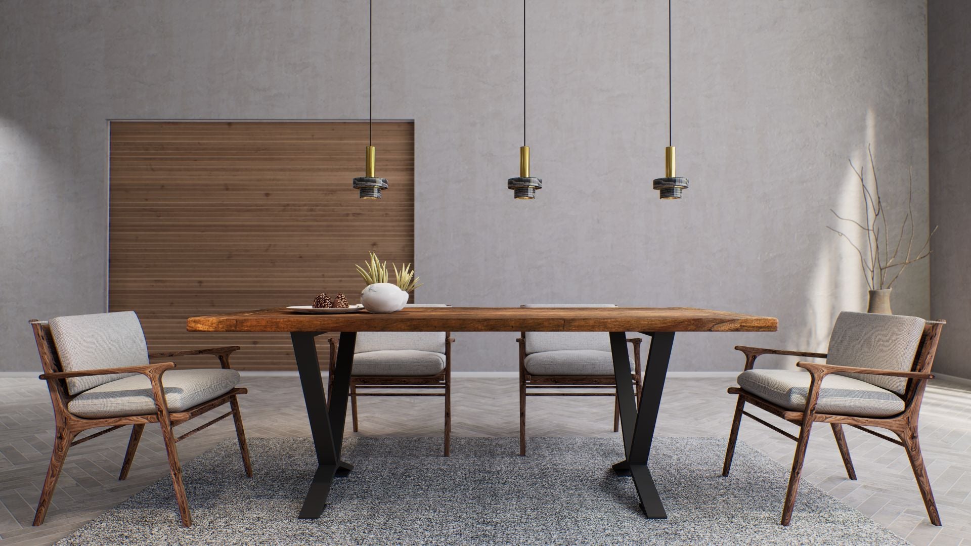 Crafted from premium Thai and Burmese teak, this dining table features a 2-inch-thick solid wood top with a beautifully brushed texture and is finished in a light walnut "Autumn" stain. Made from pure hardwood—never veneer—it celebrates the rich grain, natural warmth, and lasting durability of authentic teak. Showcasing the natural beauty of 100% solid teak, this dining table is a timeless piece of craftsmanship. The richly grained teak wood is hand-finished to enhance its warm tones and organic elegance. Supported by matte powder-coated Butterfly grey steel legs, the table combines strength with modern design. The finish resists wear, corrosion, and fading, ensuring long-term durability. |
