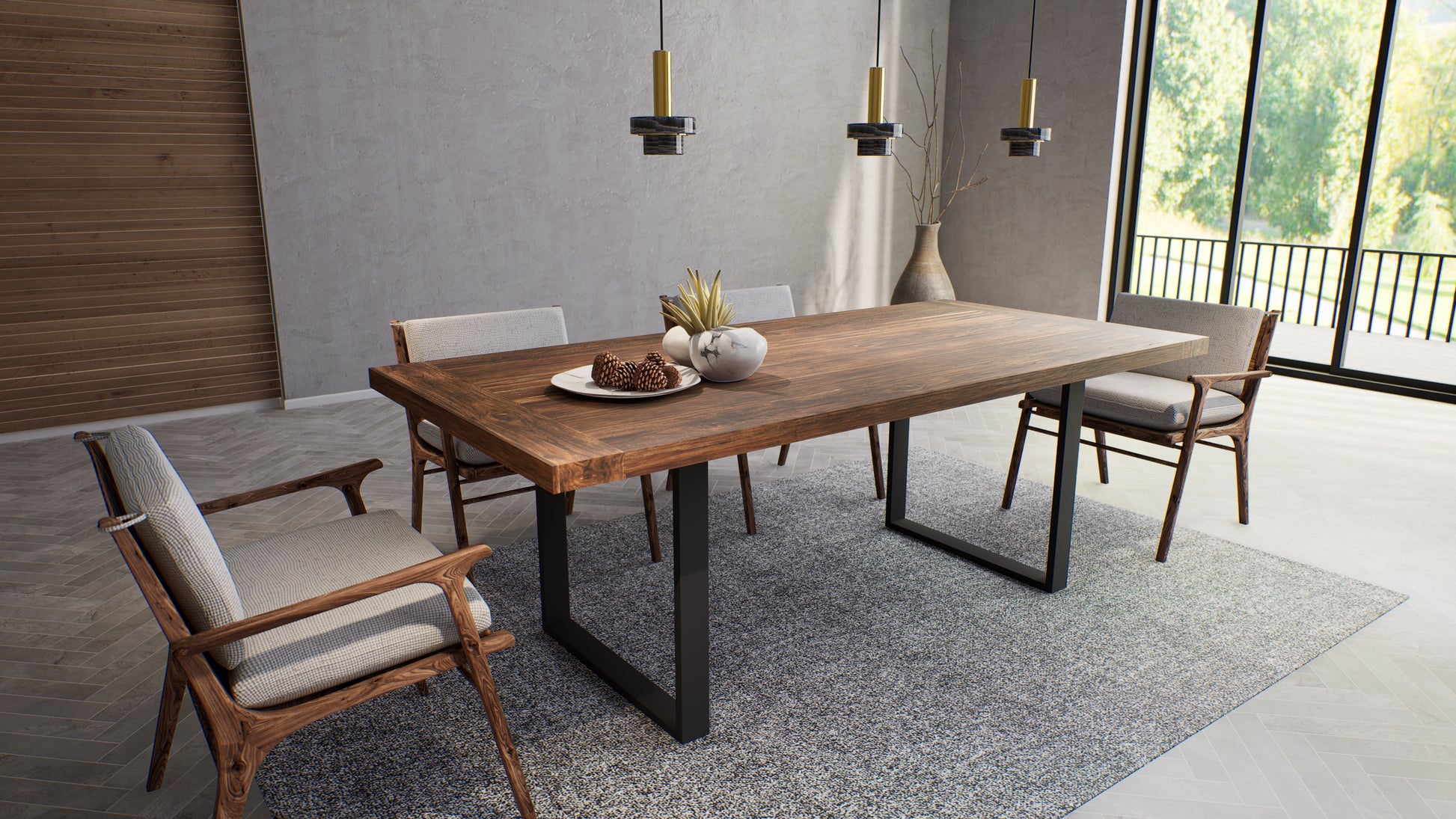Crafted from premium Thai/Burmese teak, this dining table features a 2-inch-thick solid wood top, beautifully smooth and finished in a light walnut "Autumn" stain. Made from pure hardwood—never veneer—it celebrates the rich grain, natural warmth, and lasting durability of authentic teak. Showcasing the natural beauty of 100% solid teak, this dining table is a timeless piece of craftsmanship. The richly grained teak wood is hand-finished to enhance its warm tones and organic elegance. Supported by matte powder-coated Square grey steel legs, the table combines strength with modern design. The finish resists wear, corrosion, and fading, ensuring long-term durability. |